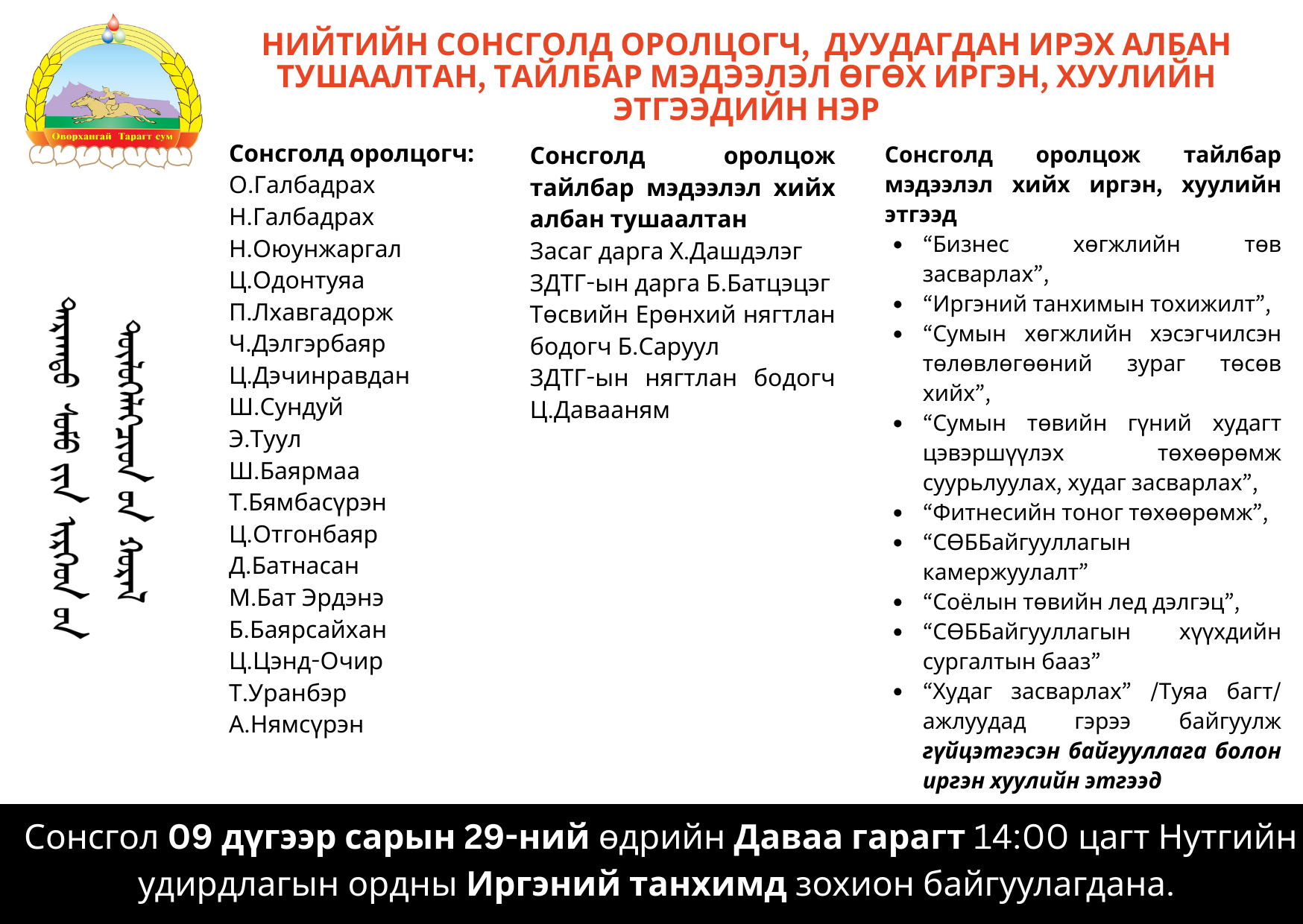 Нийтийн сонсгол зохион байгуулах журмын 12-д Сонсголд заавал оролцож, тодорхой асуудлаар тайлбар, мэдээлэл хийх төрийн байгууллага, албан тушаалтан, иргэн, хуулийн этгээд, мэргэжлийн шинжээч нарт сонсгол болохоос ажлын таваас доошгүй өдрийн өмнө сонсголд оролцох талаар мэдэгдэх бөгөөд тэдний нэрсийг нийтэд мэдээлнэ гэж заасны дагуу сонсголд оролцогч, дуудагдан ирэх албан тушаалтан, тайлбар, мэдээлэл өгөх иргэн, хуулийн этгээдийн нэрийг олон нийтэд хүргэж байна.