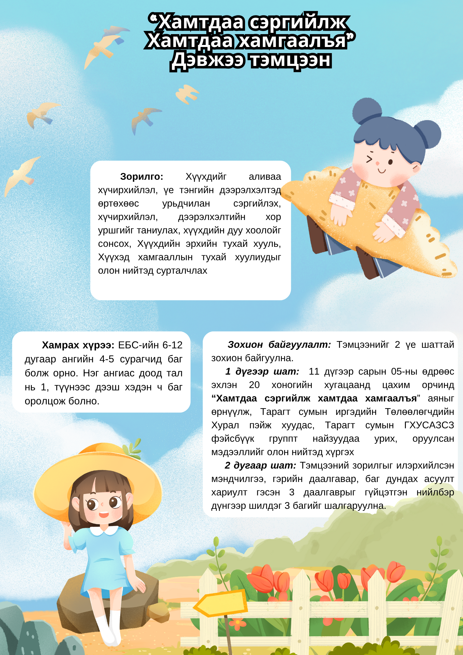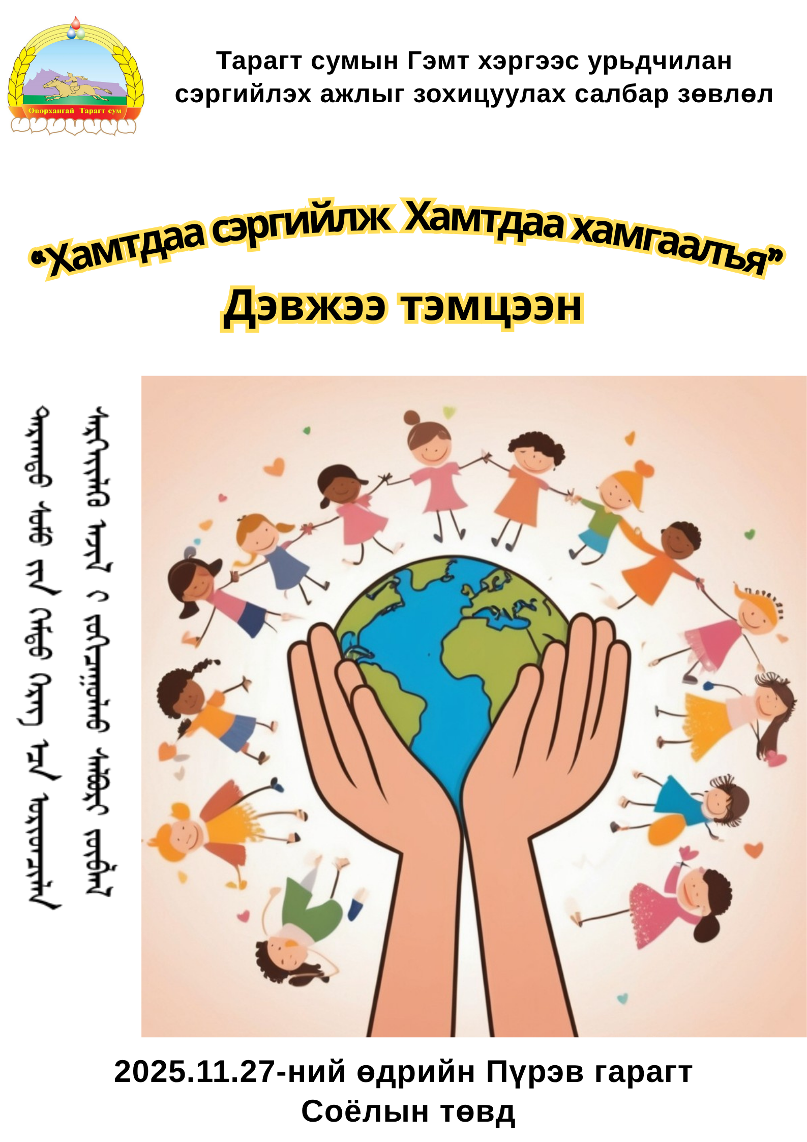 Хүүхдийг аливаа хүчирхийлэл, үе тэнгийн дээрэлхэлтэд өртөхөөс урьдчилан сэргийлэх, хүчирхийлэл, дээрэлхэлтийн хор уршгийг таниулах, хүүхдийн дуу хоолойг сонсох, Хүүхдийн эрхийн тухай хууль, Хүүхэд хамгааллын тухай хуулиудыг олон нийтэд сурталчлах зорилгоор ЕБС-ийн 6-12 дугаар ангийн сурагчдын дунд “Хамтдаа сэргийлж хамтдаа хамгаалъя” дэвжээ тэмцээнийг 11 дүгээр сарын 27-ний өдрийн Пүрэв гарагт зохион байгуулна.
